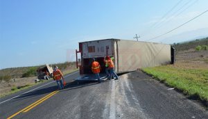 RAMOS ARIZPE, Coahuila.- Un trailero volcó su unidad a la altura del kilómetro 60+900 de la Carretera 57, en dirección al norte del estado, el cual cargaba libros de texto de la Secretaría de Educación Pública para el ciclo escolar 2019-2020.