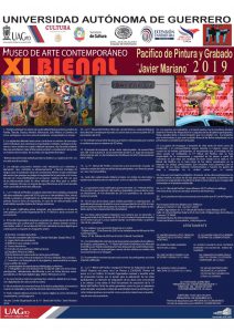 El Museo de Arte Contemporáneo de la Universidad Autónoma de Guerrero (UAGro), con el apoyo de las Secretarías de Cultura del Gobierno de México y la estatal, abrió su convocatoria para la XI Bienal del Pacífico de Pintura y Grabado “Javier Mariano” 2019, que se realiza cada dos años en la ciudad de Chilpancingo y cuyos objetivos son incentivar las artes plásticas en esos estados y fortalecer sus vínculos histórico-culturales.