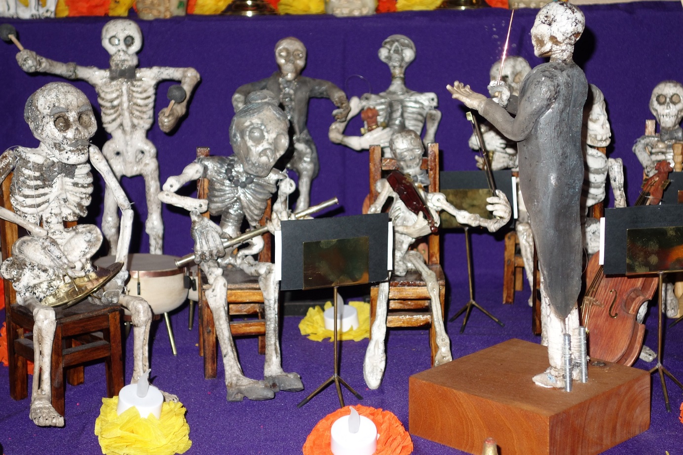 Envuelto en humo de sándalo y copal, el altar a la artista plástica portaba las banderas de México y Gran Bretaña, las dos naciones que la vieron crecer, y al lado una grandiosa orquesta de calacas en cerámica, latón y plata aseguraba una bienvenida musical digna de tan ilustre difunta visitante.